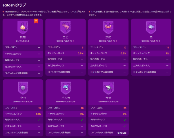 トラストダイスのVIPプログラム「satoshiクラブ」は全8段階で構成されており、 レベルが上がるごとにキャッシュバック率や特典が充実していきます。