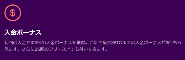 ウェルカムボーナスは3回の入金で最大3BTC(約$90,000)+ 25フリースピンを受け取れます。1回目100%最大1BTC+25FS、2回目75%最大1BTC、3回目50%最大1BTCの構成です。