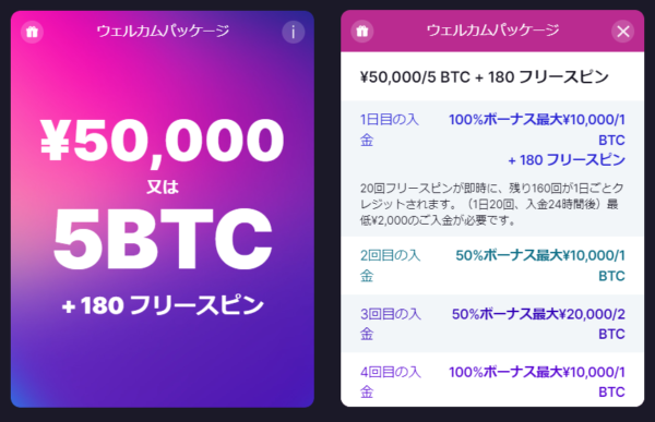 ビットスターズのウェルカムボーナスは4回の入金に分かれており、合計で最大$500(5BTC)+ 180フリースピンを受け取ることができます。