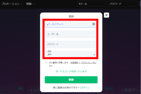 ポイント:仮想通貨を選択するとKYC不要で遊べるメリットがあります。 法定通貨を選択した場合は本人確認が必要になります。通貨は後から追加も可能です。