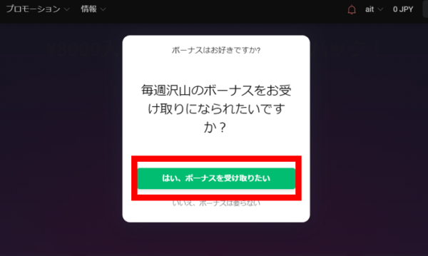 ビットスターズへの登録が完了したら、以下の手順でボーナスを受け取り、プレイを開始しましょう。