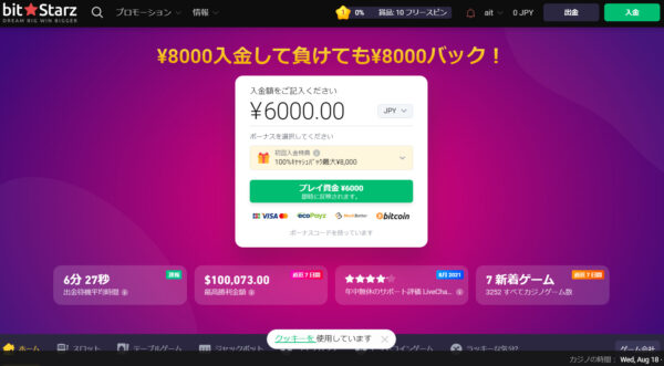 フリースピンを楽しんだ後は、初回入金でさらにお得なボーナスを獲得できます。ビットスターズでは最大5BTCの初回入金ボーナスパッケージが用意されています。 詳しくはボーナス情報ページをご覧ください。