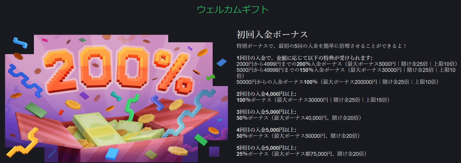 5回目までの入金ボーナス(100%/50%/50%/25%)
