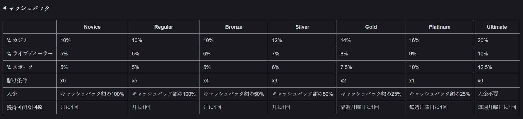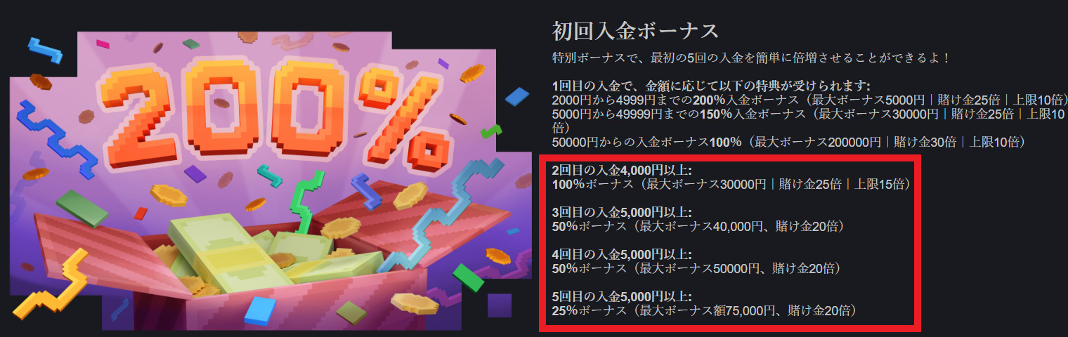 | 回数 | ボーナス率 | 最大額 | 最低入金額 | 賭け条件 |