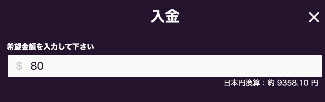 希望する入金額を入力します。最低入金額は$10です。初回入金ボーナスを最大限活用するには$377以上の入金がおすすめです。