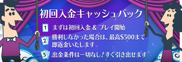 初回入金でのプレイで負けた場合、損失額の50%(最大$500)がキャッシュバックとして返金されます。初めてのオンラインカジノで不安がある方や、リスクを抑えてプレイしたい方におすすめです。