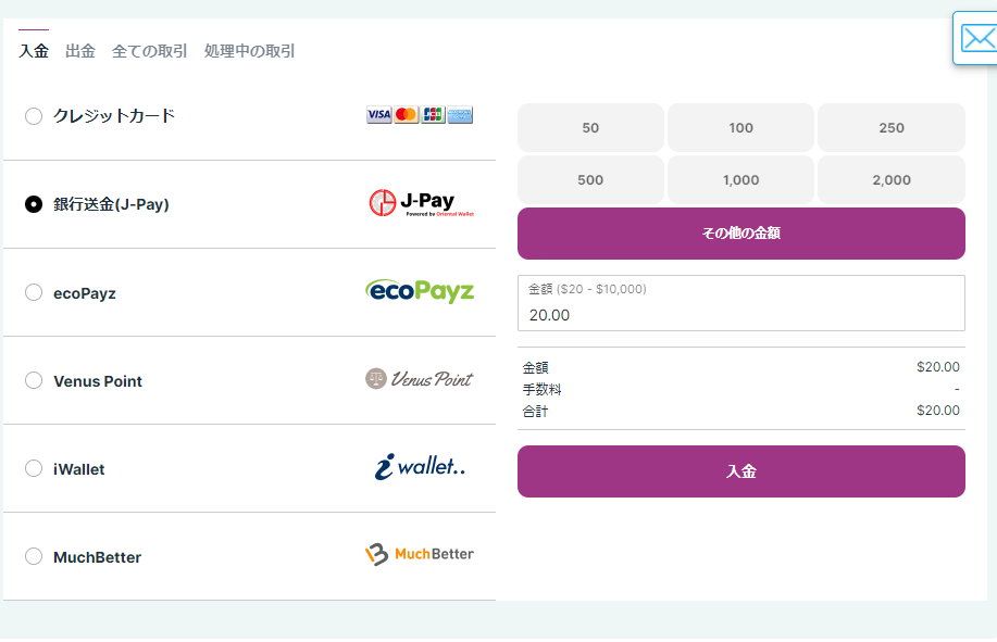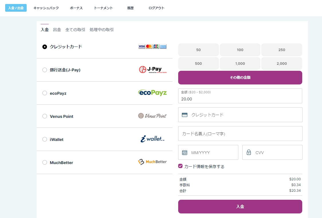 クレジットカード・銀行送金・Payz・Vega Wallet・MuchBetterは$10から入金可能です。仮想通貨は$20から入金できます。