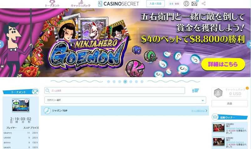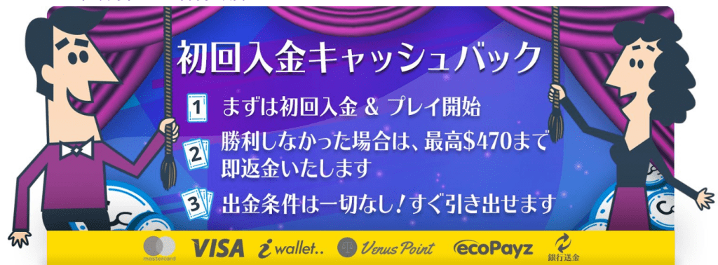 カジノシークレットでは初回入金で負けても最大$500の初回入金キャッシュバックを獲得できます。