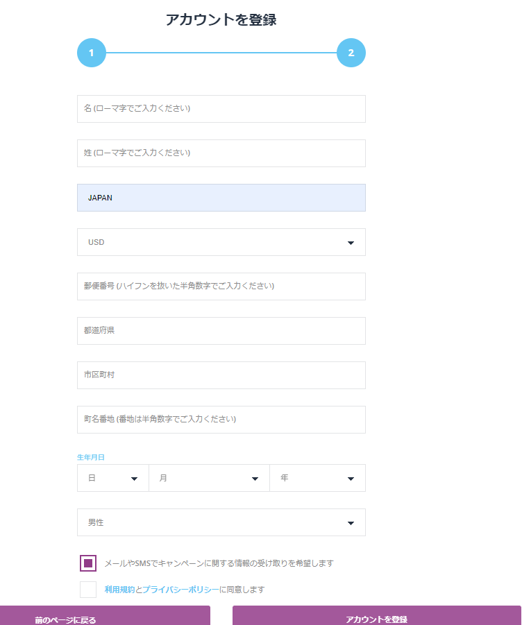 氏名(ローマ字)、住所、電話番号、生年月日等を入力して登録を完了します。本人確認書類と一致する情報を正確に入力してください。