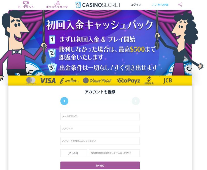 カジノシークレットはインスタントキャッシュバックが特徴のオンラインカジノです。 登録は簡単3ステップで完了しますので、ぜひこの機会にカジノシークレットを体験してみてください。