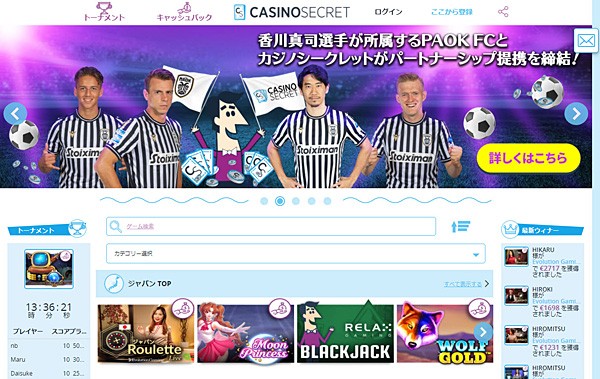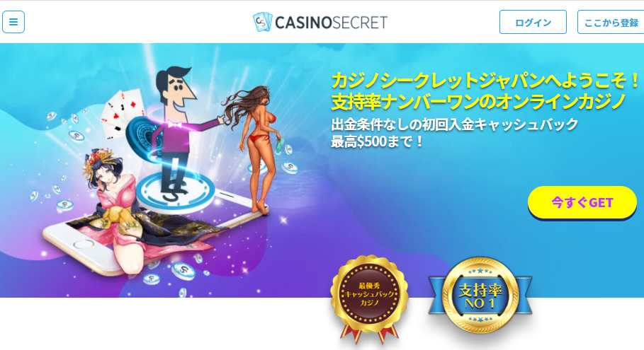 インスタントキャッシュバック(出金条件なし)を最大の売りとしており、負けた分の一部がリアルタイムで自動的に還元されるため、プレイヤーのリスクを抑えた遊び方ができます。CASINOSECRET CLUBという専用ライブカジノテーブルも運営しています。