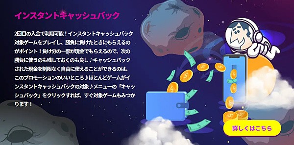 ゲームで負けた分の一部がリアルタイムで自動的にキャッシュバックされます。出金条件は一切なく、そのまま出金可能です。上限は日$30・週$60・月$150となっています。