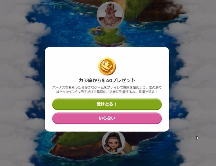 カジ旅に新規登録するだけで、$40の入金不要ボーナスがもらえます。入金なしでカジ旅を試すことができます。