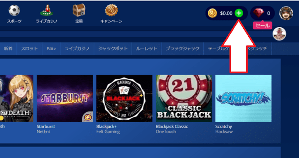 カジ旅にログインしたら、画面上部の残高横にある「+」アイコンをクリックします。入金画面が表示されます。