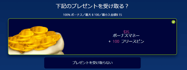 有効なボーナスオファーがある場合は、この画面で受け取ることができます。ボーナスが不要な場合は「プレゼントを受け取らない」を選択してください。