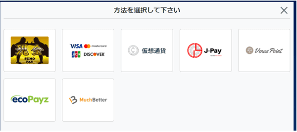 銀行振込・クレジットカード(Visa/MC/JCB)・Payz・MuchBetter・仮想通貨(BTC/ETH/LTC/XRP/USDT)から希望の入金方法を選択します。
