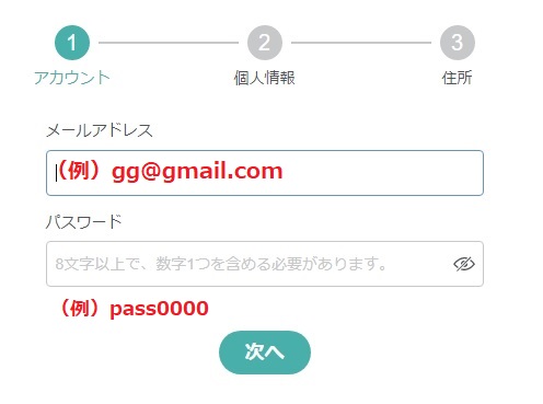 メールアドレスとパスワードを入力します。パスワードは8文字以上で数字を1つ以上含める必要があります。