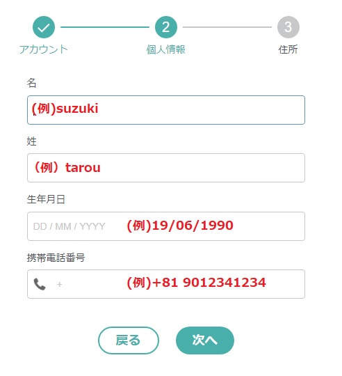 氏名(ローマ字)、性別、生年月日を入力します。本人確認書類と一致する情報を正確に入力してください。