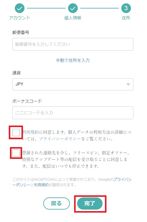 コンクエスタドール(Conquestador)の登録は5ステップで完了します。 メールアドレス、個人情報(氏名・住所・生年月日)の入力が必要です。所要時間は数分程度です。