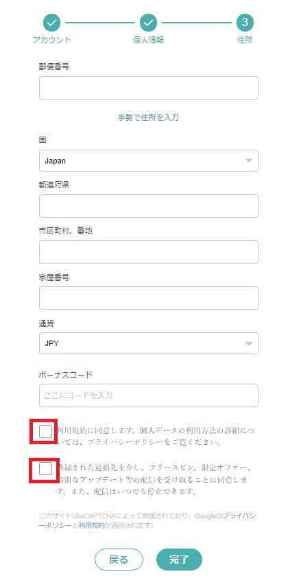 住所、郵便番号、電話番号を入力します。住所は日本語で入力可能です。建物名や部屋番号まで正確に入力してください。