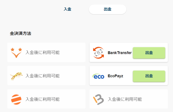 - 出金方法は銀行送金・仮想通貨・Payz・MuchBetter・Vega Wallet・Jetonの6種類