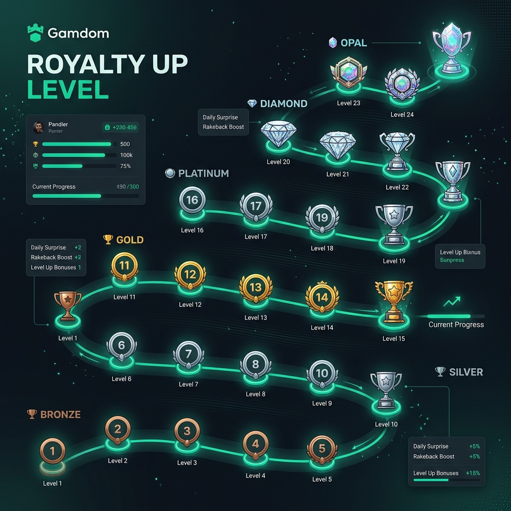 各レベルに到達するたびにキャッシュ報酬が付与されます。 レベルが上がるほど報酬額も増加し、Opalティアでは大きなマイルストーンボーナスが待っています。