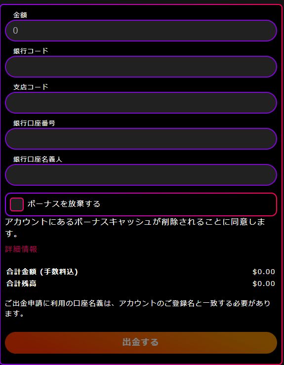 出金方法・出金額・出金先の情報に誤りがないか確認します。ボーナスの出金条件を満たしていない場合は、ボーナスを放棄して出金するかどうかの確認が表示されます。