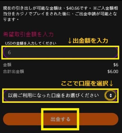 銀行送金・仮想通貨・Payz・MuchBetter・Vega Wallet・Jeton Walletの中から、ご希望の出金方法を選択してください。