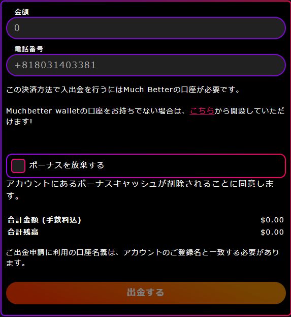 出金額と出金先の口座情報を入力します。銀行送金の場合は銀行口座情報、Payzの場合はPayzアカウント情報、MuchBetterの場合は電話番号を入力します。