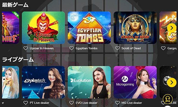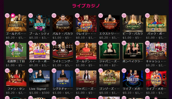 | ゲームの種類 | スロット、テーブルゲーム(バカラ、ルーレット、ブラックジャック、ポーカー等)、ライブカジノ、ゲームショー他 |