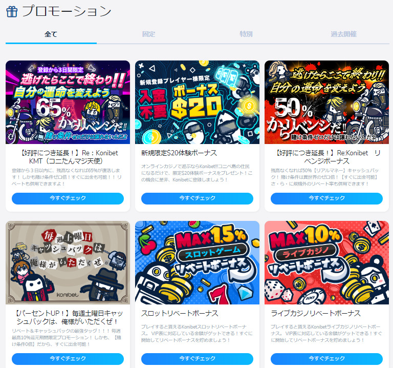 この記事では、入金不要ボーナス$20をはじめ、リベンジボーナスKMT(65%)・通常(50%)、 毎週土曜キャッシュバック、スロットリベート、ライブカジノリベートまで、コニベットで受け取れる全ボーナスの内容・条件・受取方法を詳しく解説します。