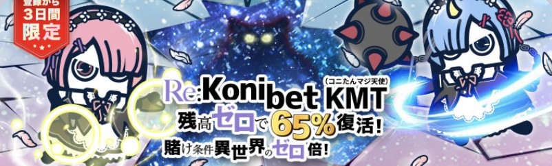 コニベットのリベンジボーナスKMTは、初回入金で負けた場合に損失額の65%(最大$650)がキャッシュバックされる特典です。 賭け条件0倍のため、受け取ったボーナスはそのまま出金可能です。