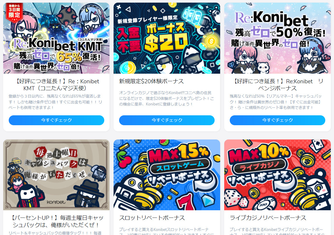 「コニベットは登録するだけで$20もらえるし、初回入金で65%キャッシュバックもある。他のカジノと比べてもかなり豪華な部類。入金不要ボーナスでまずお試しプレイできるのが嬉しい。」