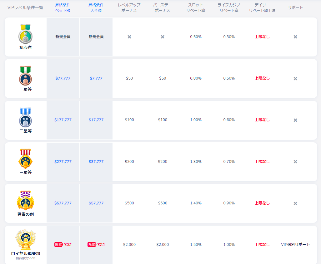 コニベットのVIPプログラムは一度昇格すると降格がないのが最大の特徴です。VIPレベルに応じてリベートボーナスやキャッシュバックのレートが向上し、専属マネージャーや特別プロモーションなどの特典も用意されています。