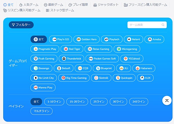 充実した検索・フィルター機能でお気に入りのゲームを簡単に見つけることができます。 プロバイダー別・カテゴリ別・人気順などの絞り込みが可能です。