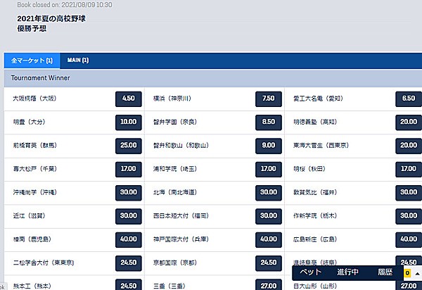 コニベットはスポーツブックにも対応しており、サッカー・バスケットボール・テニスなどの主要スポーツに加え、 日本向けのコンテンツとしてRIZINや高校野球にもベットが可能です。