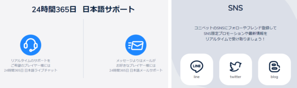 コニベットのカスタマーサポートは24時間年中無休で対応しています。 ライブチャット、メール、LINEの3つの窓口があり、 日本語での問い合わせにも対応しているため安心です。