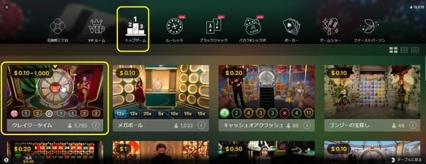 ライブカジノ特化。Funky Time専用テーブルが常時稼働中。