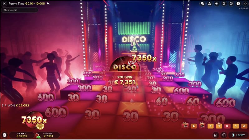 最高ランクのボーナスゲーム。VIPルームに案内され、ディスコフロアで踊るキャラクターを選んでマルチプライヤーを獲得。最大25,000倍の爆発配当が狙えます。