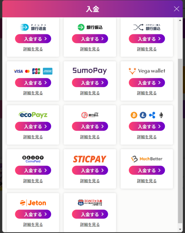 クレカ・銀行送金・仮想通貨・Payz・Vega Wallet・MuchBetter・Jeton・STICPAY・SumoPayから選びます