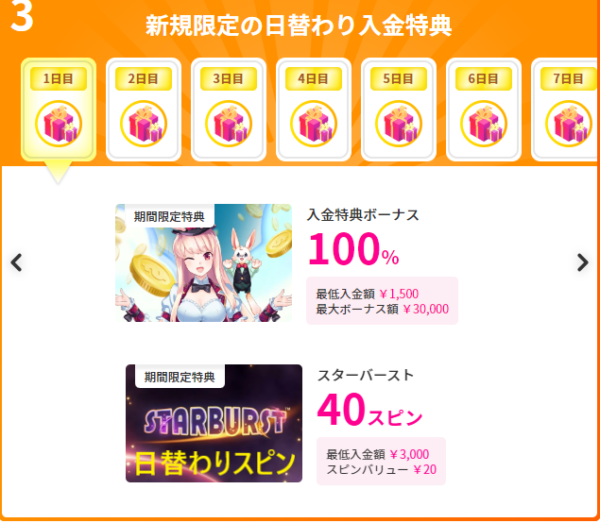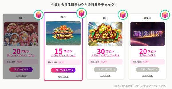 新規登録後の入金では、フリースピンやボーナスマネーなどの特典が日替わりで用意されています。入金額や対象ゲームは日ごとに変わるため、ログインして確認しましょう。
