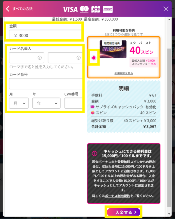 クレジットカード・銀行送金・Vega Wallet・MuchBetter・Jeton Wallet・STICPAY・SumoPay は¥1,500から入金可能です。仮想通貨(BTC)は¥4,000から、Payzは¥3,000から入金できます。