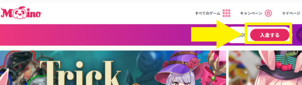 ミスティーノにログインし、画面上部の入金ボタンを押します
