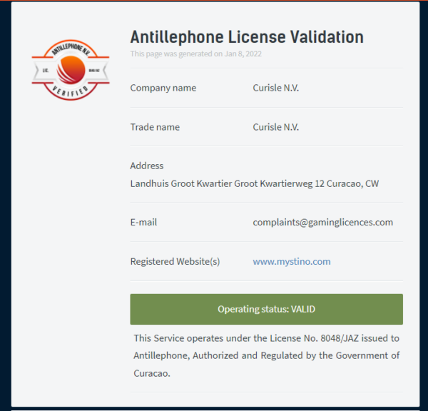 | キュラソーライセンス | Antillephone License Validationにより、キュラソー政府公認のライセンスを保有し合法的に運営されています。 |