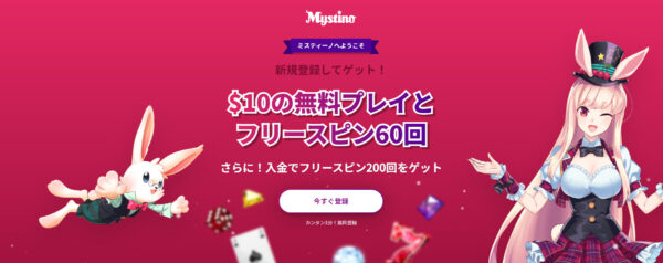 ミスティーノでは新規登録するだけで現金ボーナス+フリースピンがもらえます。 入金なしでカジノを体験できるため、初めての方でもリスクなく始められると好評です。