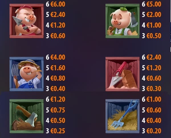 高配当シンボルは3匹の子ぶたです。それぞれ異なるデザインで、最も高い配当を持っています。 タンブル連鎖でこれらの子ぶたシンボルがワイルドに変換されるPiggy Wild機能が、このスロットの最大の特徴です。