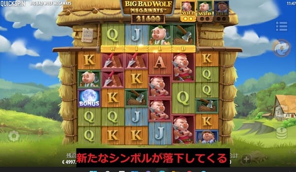 ビッグバッドウルフ メガウェイズの最大の特徴がPiggy Wild機能です。 リール上部に3匹の子ぶたが配置されており、タンブル(連鎖)が発生するたびに子ぶたシンボルがワイルドに変換されていきます。