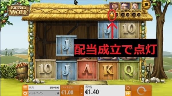 ビッグバッドウルフは25本のペイラインで配当が判定されます。 左端のリールから連続して同一シンボルが3つ以上揃うと配当が成立します。 一般的なペイライン方式なので、スロット初心者にも分かりやすいゲーム性です。