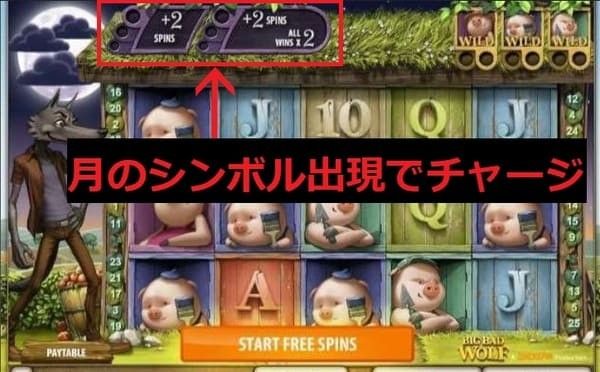 ビッグバッドウルフのフリースピンは、オオカミが家を吹き飛ばす演出と月シンボルによるスピン追加が特徴です。