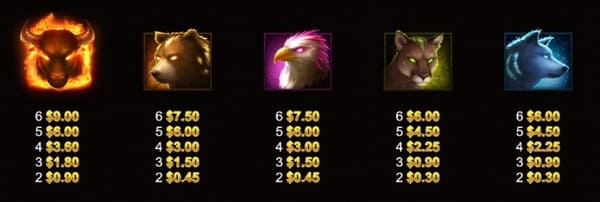 高配当シンボルは5種類の野生動物です。$0.60ベット時の配当は以下の通りです。